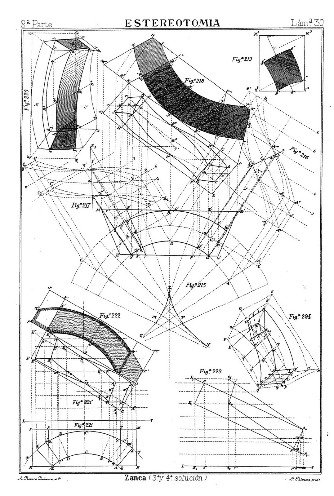 Llegados a este punto y aunque solo sea por redundancia, cabe recordar aquellas “láminas de dibujo”, que se estudiaban en las escuelas de arquitectura del siglo XIX, sobre “estereotomía de la piedra”, en las que se mostraban métodos geométricos, para el trazado de las formas mediante el “abatimiento” de planos, desarrollos en verdadera magnitud, y métodos parecidos, que luego permitían construir las “plantillas” y “baiveles” que guiaban a los canteros en la fabricación de “sillares” y “dovelas” de piedra, que cuando eran “levantadas” y “colocadas” con esfuerzo considerable, tenían que encajar entre si con la exactitud suficiente para asegurar la estabilidad del conjunto.