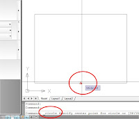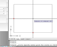 En la imagen siguiente sigue cargada la orden círculo, y sobre el punto anterior vemos superpuesta una marca roja con forma de signo “+” mientras vemos en el otro lado del rectángulo, la “marca” de punto medio, y el cursor gráfico que se desplaza aproximadamente por la alineación marcada de este nuevo punto medio.