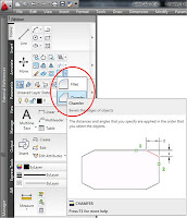 Ahora tenemos las líneas interiores cruzadas en las esquinas y para corregirlo podemos aplicar la orden «EMPALME(_FILLET)» o bien «chaflán» indistintamente. Al ejecutar esta orden y antes de designar el primer objeto deberíamos asegurarnos que el radio de empalme está configurado en «0», para lo cual seleccionamos primero la opción «Radio» y esto se hace bien escribiendo una «R» en la línea de ordenes, ( la letra mayúscula de la opción correspondiente ) o si tenemos activada la entrada dinámica desplegando el menú del cursor, pulsando la flecha hacia abajo y seleccionando la opción. A continuación se escribe «0» o se confirma con «Intro», si ya estaba definida esa distancia. Finalmente continuamos la rutina de la orden señalando en la pantalla las dos líneas interiores concurrentes en una esquina.
